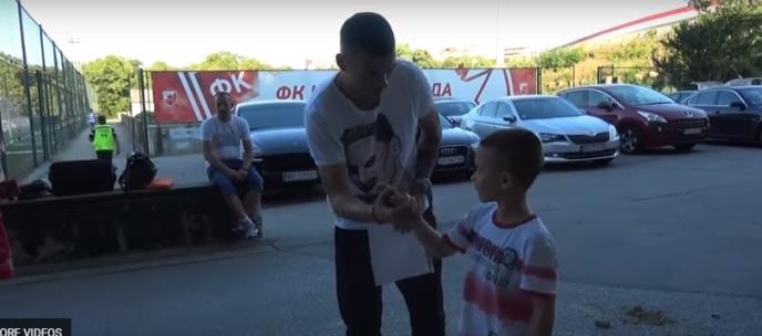 Radonjić se veoma obradovao pooklonu i susretu sa malim Dušanom, pa je čak i tokom treninga na pomoćnom terenu Marakane dotrčao do ograde i pozdravio se sa mališanom i njegovim sestrama.