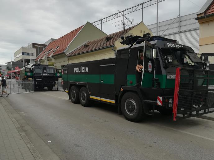 Na prilazu stadionu mogu se videti i borna kola, koja su parkirana duž ulice, koja je iza njih zatvorena ogradom. U borna kola primetan je i veliki broj pripadnika specijalnih snaga policije.