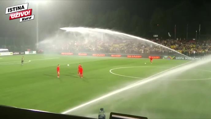 Voda je krenula da prska na obe strane terena, a fudbaleri su pokušavali da izbegnu mlaz.