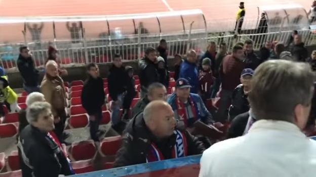 Na snimku se vide navijači Radničkog kako najpre uvredama i psovkama zasipaju ljude u loži, čak se lepo vidi i trenutak kada je poletela flaša.