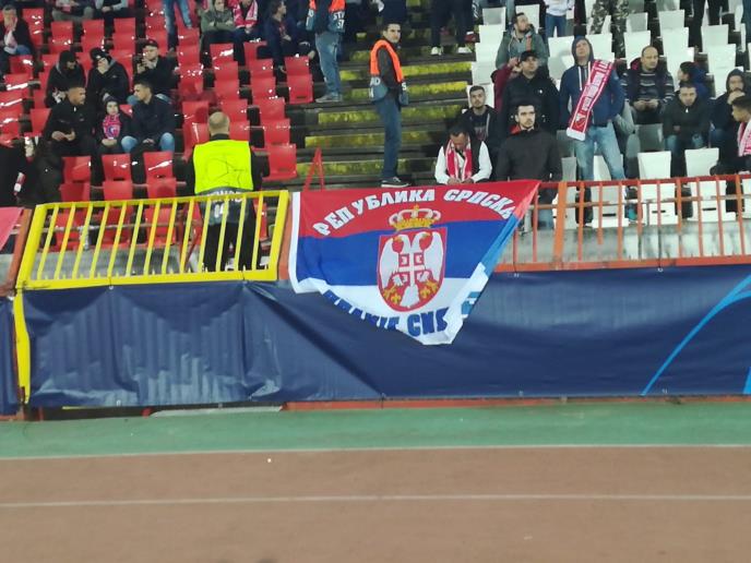 Utakmica Crvena zvezda - Liverpuil igra se od 18.55 na stadionu Rajko Mitić, a na tribinama je i jednas zastava Srbije na kojoj piše Sidnej.