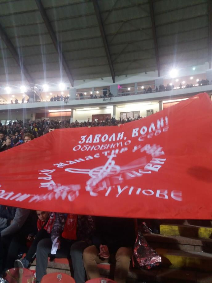 Na utakmici između Crvene zvezde i Liverpula na zapadnoj tribini "Marakane" našla se i zastava akcije "Obnovimo sebe, podignimo Stupove".