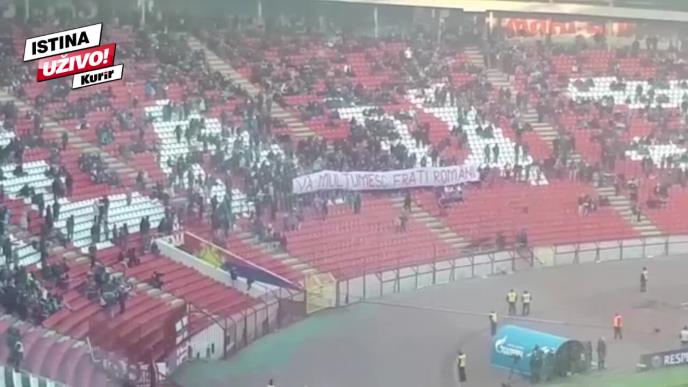 Zato su danas, na utakmici sa Crnom Gorom, srpski navijači na Severu razvili transparent na rumunskom jezikom sa porukom: "Hvala braćo Rumuni".