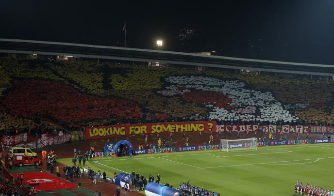 Na istočnoj tribini navijači Zvezde su napravili sliku pehara namenjenog prvaku Evrope i ispisali godinu 1991, kada su se radovali osvajanju Kupa šampiona.