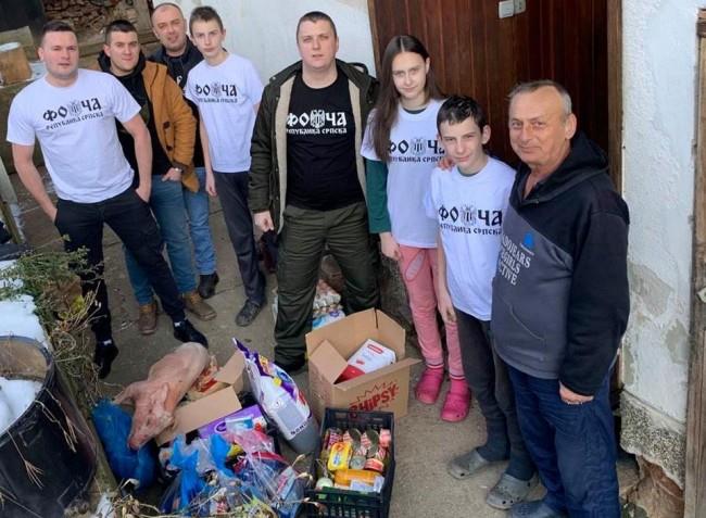 Pripadnici grupe "Grobari Foča" u naselju Obilićevo uručili su glavi porodice Željku Vukadinkoviću božićnu pečenicu i paket sa osnovnim životnim namirnicama.