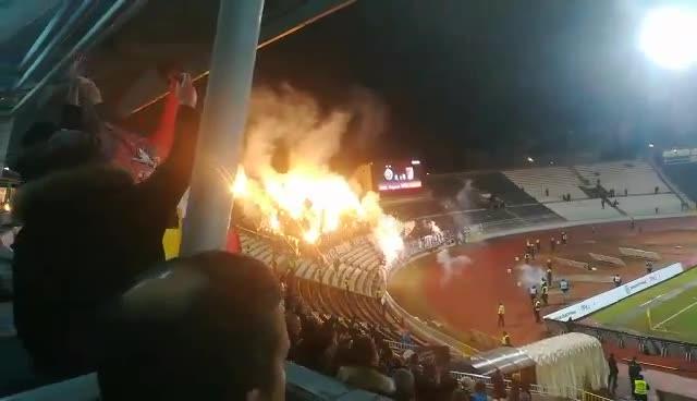 U 20. minutu navijači crno-belih su napravili veliku bakljadu, a od pirotehničkih sredstava, osim baklji, koristili su i vatromet, dimne bombe...