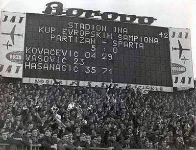 Ukratko, Partizan je startovao taktički vrlo zrelo, bilo je jasno svakom od onih 50.000 duša prisutnih na stadionu JNA da je prva runda dobijena na samom početku i da je Partizan psihički jači partner. Brzo vođstvo samo je učvrstilo rešenost crno-belih fudbalera. Sparta je bila nadigrana. Golovi nisu bili plod slučaja ili greške Čehoslovaka, već maštovitih kombinacija Partizanovog napada. Pored 5 golova, bugarski sudija Rumenčev (odlično je sudio) je poništio Hasanagiću, najlepši gol na meču, koji je ovaj postigao makazicama, navodno zbog nekog ofsajda od strane Kovačevića…