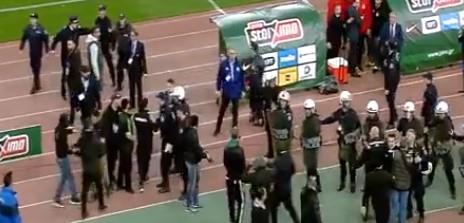 U 70. minutu, pri vođstvu crveno-belih od 1:0, domaći navijači su napravili težak incident! Uleteli su na teren, potukli se sa policijom...