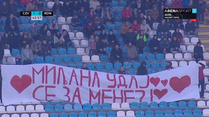 Jedan od navijača sa severne tribine je raširio transparent sa svojim drugarima na kome je pisalo: ''Miljana, udaj se za mene.''