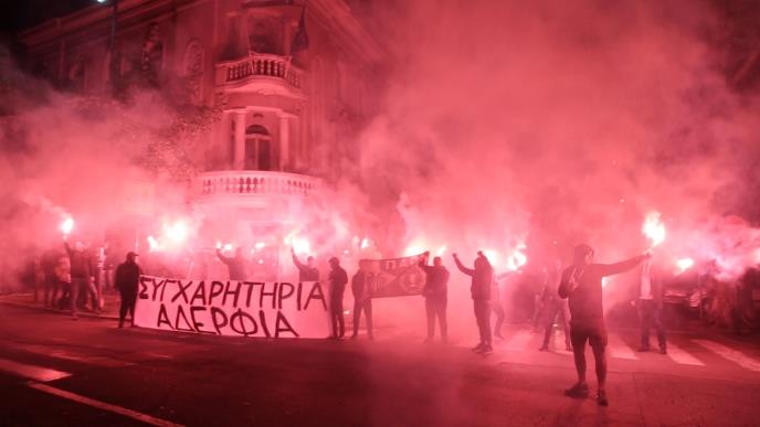 Nekoliko stotina Partizanovaca okupilo se ispred Grčke ambasade u Beogradu i bakljama i transparentima proslavilo je titulu svog bratskog kluba PAOK-a.