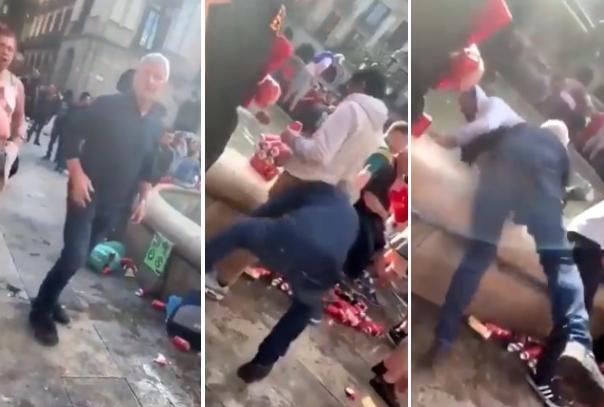 Ali ono što je najstrašnije u svemu tome jeste što je glavni akter prosedi, stariji čovek. Očigledno osokoljen podrškom navijača Redsa koji sve snimaju telefonima, ovaj 'gospodin' se itekako zabavlja bacanjem ljudi u fontanu!