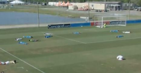 Sudija je "naredio" da svi legnu na travu, što su mladi fudbaleri i učinili, i to bez nervoze i panike. Moguće je da su se već sretali sa ovakvom situacijom.