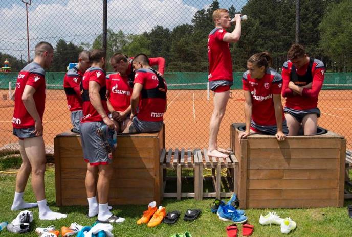 Finiš treninga obeležila je igra na dva gola. Naši fudbaleri odigrali su dva puta po deset minuta na skraćenom terenu. S obzirom na to da je izuzetno naporan dan iza naših fudbalera po završenom treningu sačekala su ih kante sa ledom u kojima su rado proveli vreme, kako bi opustili mišiće i preventivno uticali na upale posle izuzetno napornog dana.