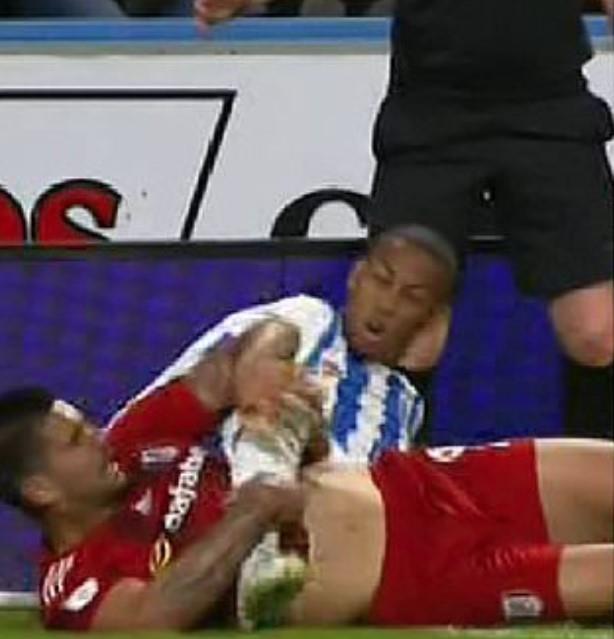 Doduše, na snimku se ne vidi najjasnije, a verujemo da se Mitrović upravo na to žalio, iako veoma prenaglašeno, moguće je da je igrač Hadersfilda po oku zakačio Mitrovića.