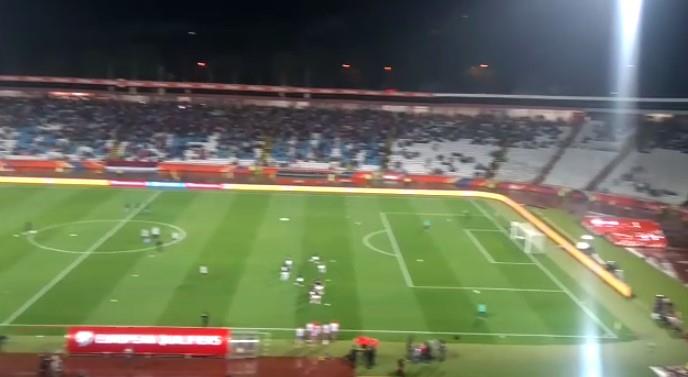 Fudbaleri obe ekipe su se zagrevali, a navijači tiskali ispod krova.