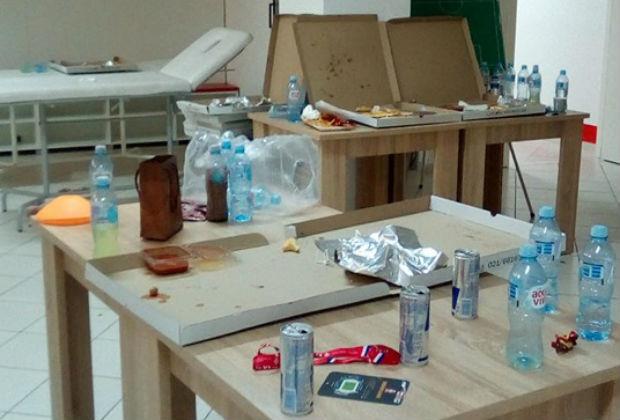 Prazne kutije pica, ostaci parčića pica, limenke energetskih pića i flašice vode, razni papirići... sve je to bilo razbacano po celoj svlačionici.