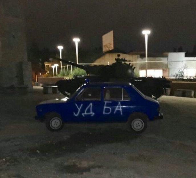 Naime, Partizanovci su večeras ispred Marakane , a odmah pored ''famoznog'' tenka, dovezli policijski automobil i uz poruku na istom: