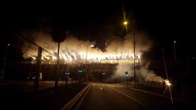 Navijači Partizana okupljeni u navijačku grupu "Alkatraz" priredio je spektakularnu bakljadu na Pančevačkom mostu i time pozvao pristalice ovog kluba da dođu u što većem broju u nedelju na večiti derbi.