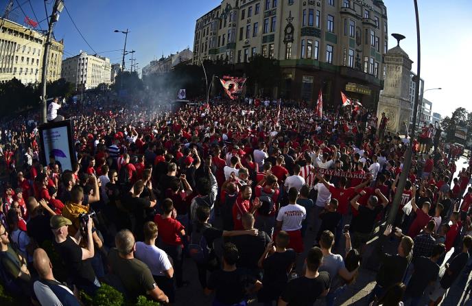 Navijači Crvene zvezde i Olimpijakosa prave feštu kod Terazijske česme.