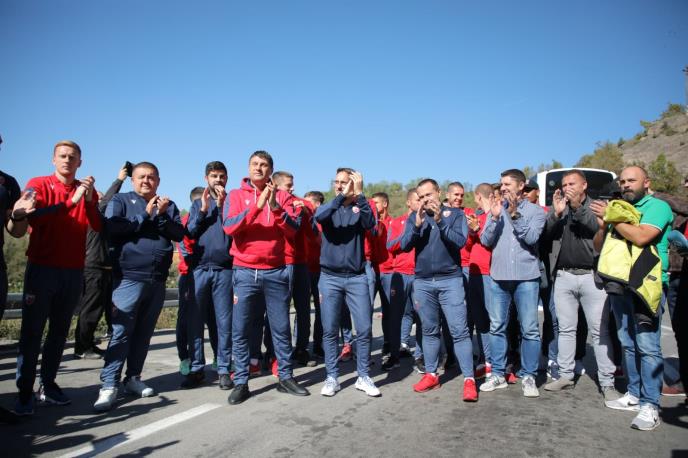 Trener Crvene zvezde Vladan Milojević sa fudbalerima je izašao iz autobusa i pozdravio okupljene navijače na Jarinju.