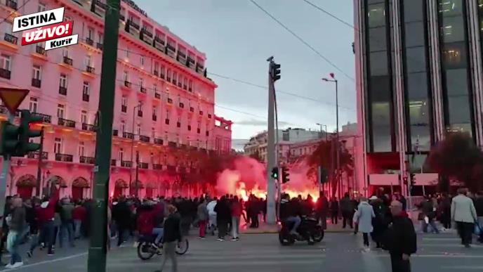 Kolona od više hiljada navijača Crvene zvezde i Olimpijakosa, popularnih "Delija" i "Gejt 7" pošla je sa trga "Sintagma" ka stadionu "Georgijos Karaiskakis" gde se od 21 čas igra utakmica 6. kola grupe B Lige šampiona.