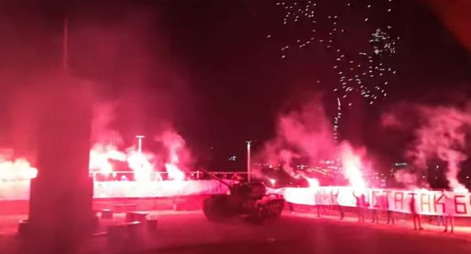 "Delije" poručuju da "osećaju strašan nedostatak buke", pa su ispred severne tribine "Marakane", kod tenka, napravile veliku bakljadu.