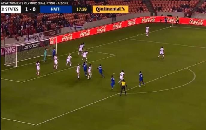 Ženska fudbalska reprezentacija Sjedinjenih Američkih Država pobedila je u drugom krugu kvalifikacija za Olimpijske igre selekciju Haitija rezutlatom 4:0, ali utakmica će ostati zapamćena po neobičnom detalju iz 18. minuta.