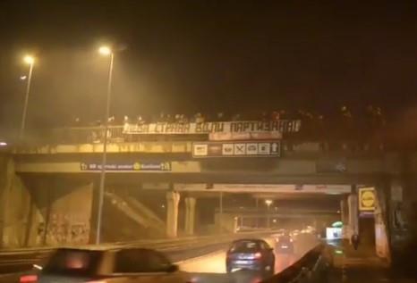 Navijači Partizana napravili su "noćnu bakljadu" uz raširen transparent na kojem je pisalo "Leva strana voli Partizana".