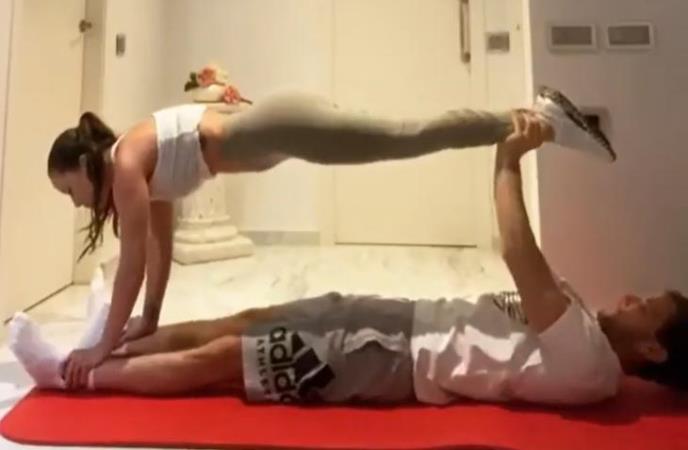 Hrvatski fudbaler Ivan Rakitić podelio je na društvenim mrežama video u kojem vežba, a u svemu tome mu pomaže zgodna supruga Rakel Mauri.