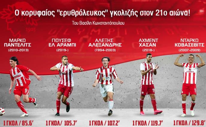 Darko Kovačević je igrao za Olimpijakos od 2007. do 2009. godine i postigao je 31 pogodak. Marko Pantelić je crveno-beli dres nosio od 2010. do 2013. godine i za to vreme postigao 27 golova.