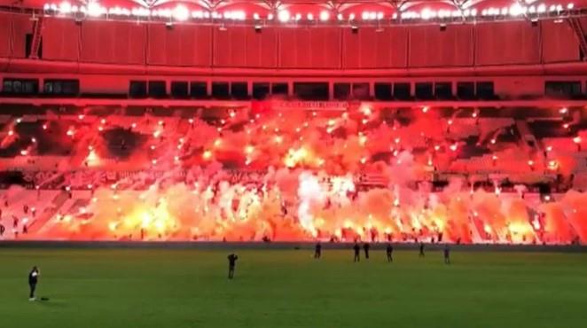 Držeći socijalnu distancu zbog koronavirusa navijači su bili razmaknuti po tribinama i zapalili su veliki broj baklji kako bi n obeležili klupski rođendan.