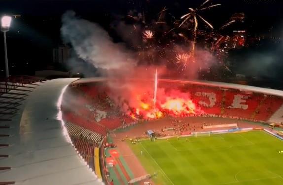 Navijači Crvene zvezde proslavili su pobedu svog tima nad Radnikom u meču 28. kola Super lige Srbije vatrometom iznad severne tribine stadiona "Rajko Mitić".
