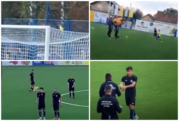 Zatim je sleteo na rame jednom igraču koij je uspeo da ga uhvati i preda četvrtom sudiji.
