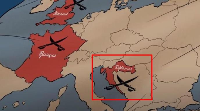 Predstavljena je mapa Evrope prema aktuelnim teritorijama, ali je Srbija ovde daleko veća i zahvata Makedoniju, Albaniju, Crnu Goru i Bosnu i Hercegovinu.