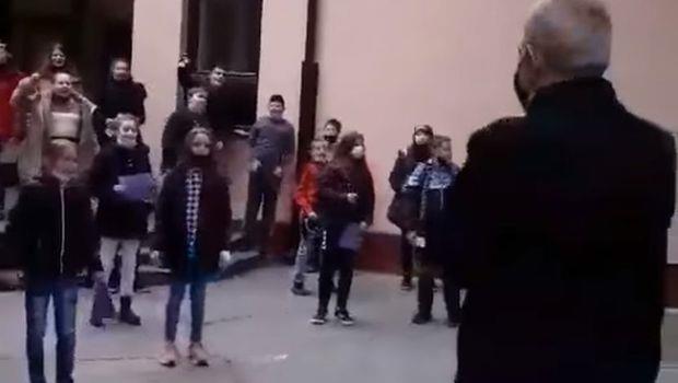 Učenici osnovne škole u Belom Blatu kod Zrenjanina ispratili su direktora te ustanove u penziju i tom prilikom mu otpevali pesmu navijača Partizana.