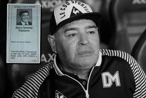 "Poslednji pozdrav velikom Dijegu Armandu Maradoni. Mnogo toga nas je spajalo. Tvoji Nikšićani i Podgoričani iz Kafe bara "Ex Ponto" Danko, Vlado, Džoni, Krle, Kumara i Goša", stoji u čitulji za Maradonu.
