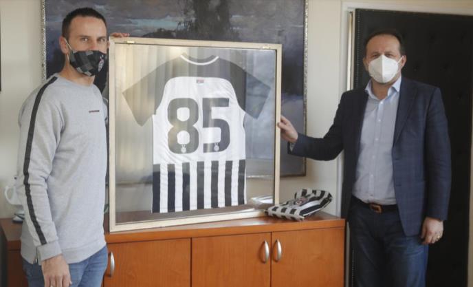Posle kraćeg razgovora, uz poštovanje svih mera zaštite od Kovid-19, Ostojić je uručio uramljen dres sa brojem 85, kao i maske sa obeležjima FK Partizan, za osoblje kliničkog centra koje navija za klub iz Humske.