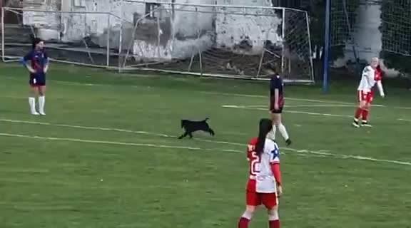 Videvši loptu na travnati tepih utrčao je mali pas i prekinuo meč. Nije želeo da napusti teren, trčao je za loptom, sve dok jedna od fudbalerki nije uspela da sa njim i loptom pretrči čitav teren i psa ostavi u društvu nekoga kraj gol aut - linije.