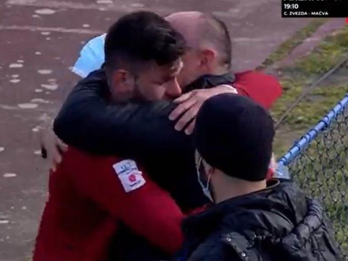 Posle meča, gorostasnog napadača su slomile emocije i on je otrčao na tribine gde je zaplakao u zagrljaju srtica.