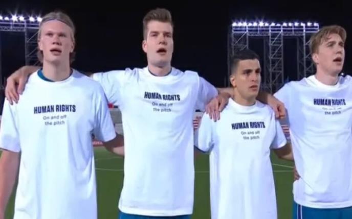 Naime, tokom intoniranja himne reprezentativci Norveške nosili su majice sa natpisom: "Ljudska prava, na terenu i van njega".