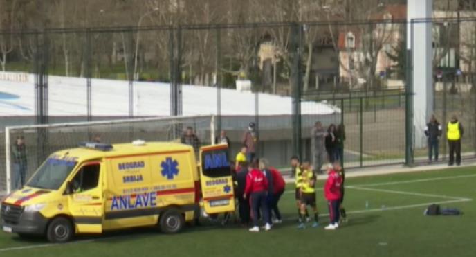 Strašne scene viđene na utakmici kadetske lige Srbije između Crvene zvezde i kraljevačkog FK Kiker u Beogradu. Fudbaler gostiju Miloš Đurović doživeo je tešku povredu nakon sudara sa golmanom crveno-belih i odmah je zbog potresa mozga prebačen u bolnicu.