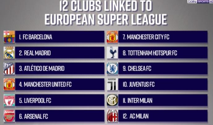 Engleski fudbalski klubovi Arsenal, Čelsi, Liverpul, Mančester siti, Mančester junajted i Totenhem, među 12 su ekipa koje su se dogovorile da uđu u novu Evropsku Superligu (ESL), javio je BBC.