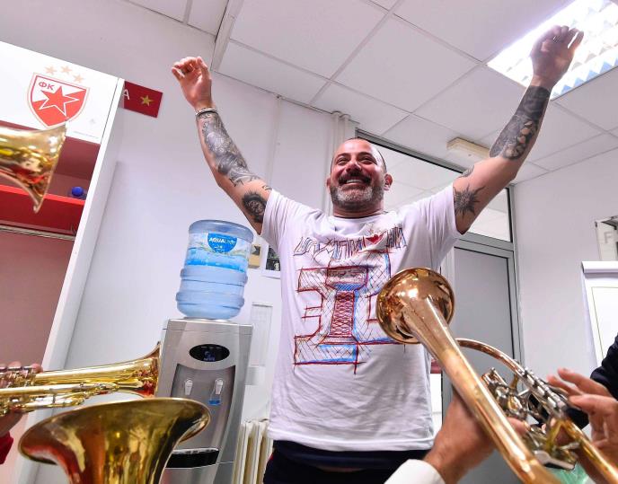 Slavlje se sa stadiona prenelo u svlačionicu gde su u toku večeri stigli i trubači.