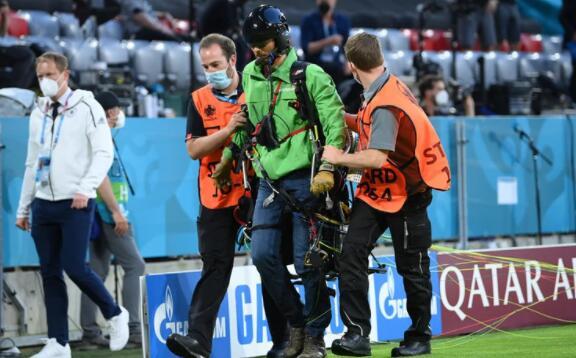 Svi ljubitelji fudbala, koji su u utorak uveče pratili duel Evropskog prvenstva između fudbalera Nemačke i Francuske (1:0) ostali su u čudu kada je na teren sa namerom da prekine meč uskočio padobranac!