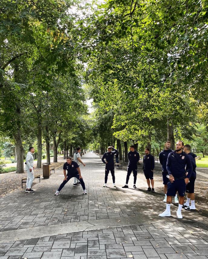 U lepom ambijentu Neđerdej parka koji se nalazi odmah pored stadiona na kome si igra utakmica večeras od 20.45, reprezentativci naše zemlje obišli su krug oko fontane, a potom uz vežbe i instrukcije kondicionog trenera Kacuhita Kinošija obavili lagano istezanje ispred hotela Akvatik.