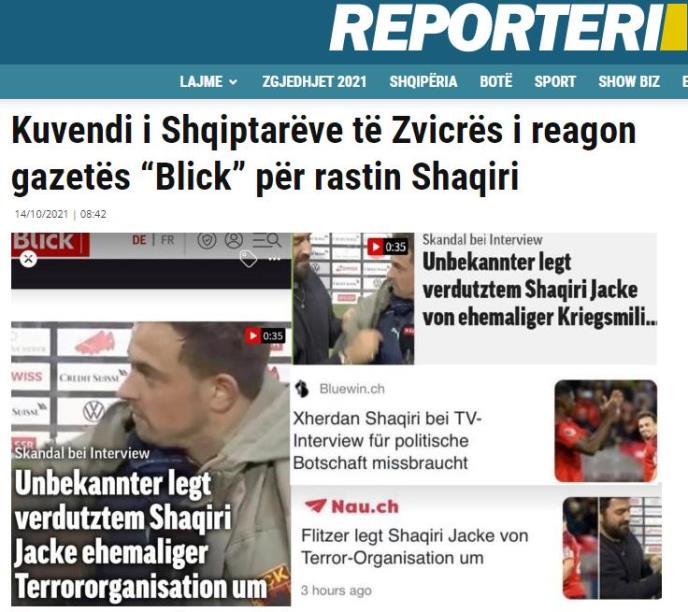 - Posle toga švajcarski mediji počeli su da izveštavaju o događaju, i to tako da su amblem na jakni nazivali "obeležjem terorističke organizacije UČK". Skupština Albanaca u Švajcarskoj reagovala je i objavila javno saopštenje usmereno protiv lista Blik.