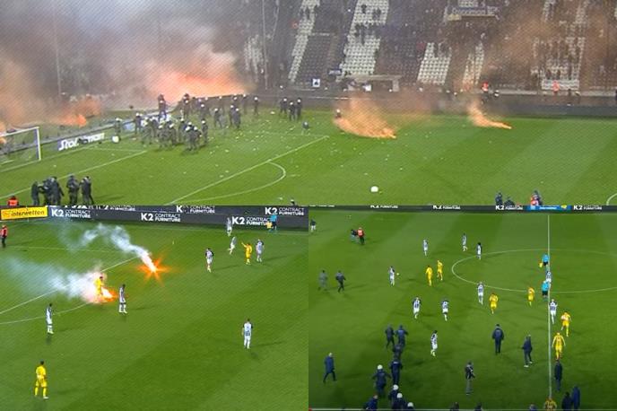 Navijači solunskih crno-belih napravili su ogroman incident kojim su prekinuli utakmicu. Na terenu su umesto fudbalera, koji su se brzo sklonili u svlačionice, bile baklje, ali i pripadnici policije kao i navijači.