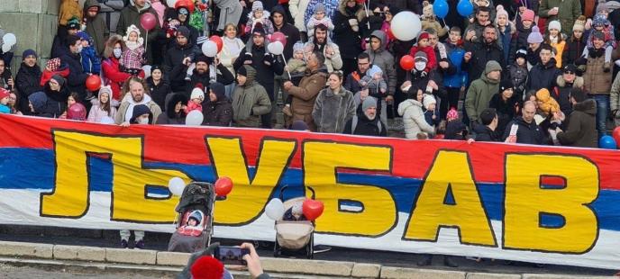 Nekoliko stotina pristalica Crvene zvezde sa suprugama i decom skupili su se ispred Skupštine Srbije noseći transparent - Ljubav je zakon! Slova su bila ispisana na ćirilici preko srpske trobojke.