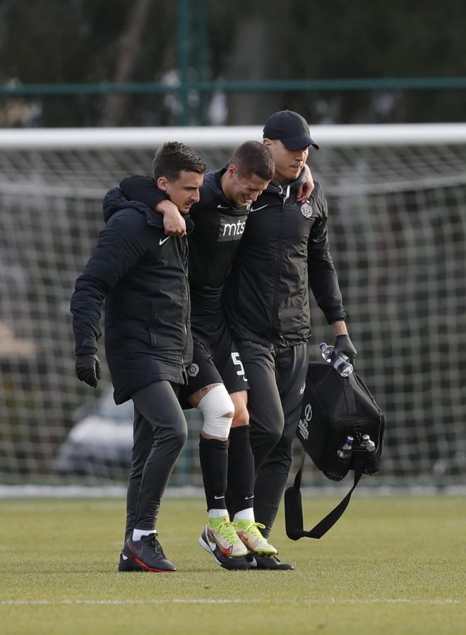 Vezista Partizana je nakon jednog duela na samom startu utakmice ostao da leži na travi. Po njegovoj gestikulaciji odmah je bilo jasno da neće moći da nastavi meč.