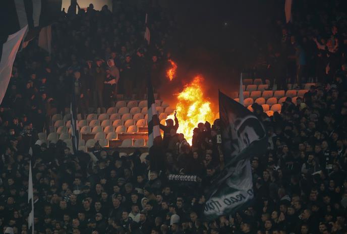 Vatrene pristalice crno-belih boja su napravile dimnu zavesu, i na atletsku stazu pobacale gomilu polomljenih stolica.